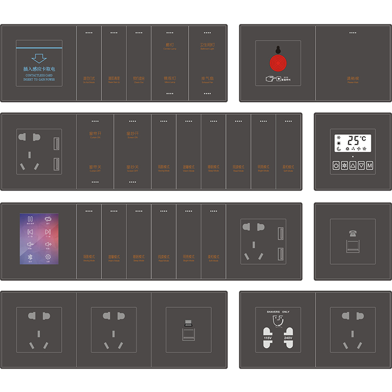 7.功能:灯光、空调、窗帘、电话、网络、USB充电、插座、勿扰、清理、紧急呼叫